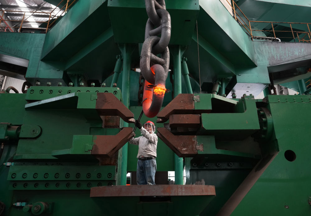 2024年6月4日,江蘇泰州靖江市江蘇亞星錨鏈股份有限公司工人在生產(chǎn)車間作業(yè)。該公司前身是40多年前創(chuàng)辦于靖江東興鎮(zhèn)的一個小廠,經(jīng)過多年發(fā)展,逐漸成長為國家級制造業(yè)單項冠軍示范企業(yè)。目前該公司船用鏈條全國市占率達70%,全球市占率超50%,業(yè)務(wù)已拓展到海洋鉆井平臺、海洋生產(chǎn)平臺、海上風電設(shè)施的系泊錨鏈等領(lǐng)域。
