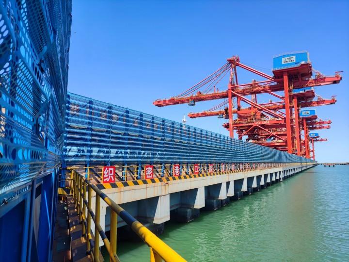 秦港股份滄州礦石港務(wù)公司黃驊港散貨港區(qū)礦石碼頭首創(chuàng)的分體式可移動防風(fēng)網(wǎng)。秦港股份供圖