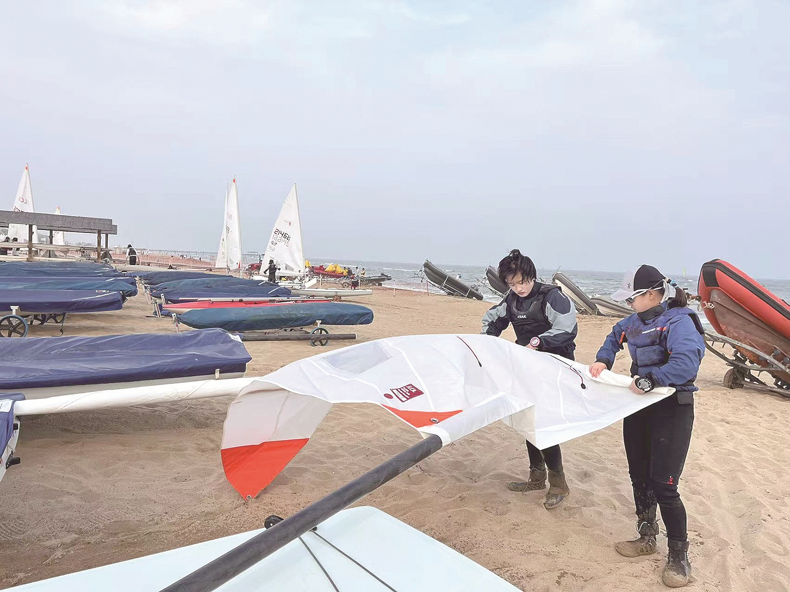 北京航海中心的隊(duì)員在岸邊收帆。