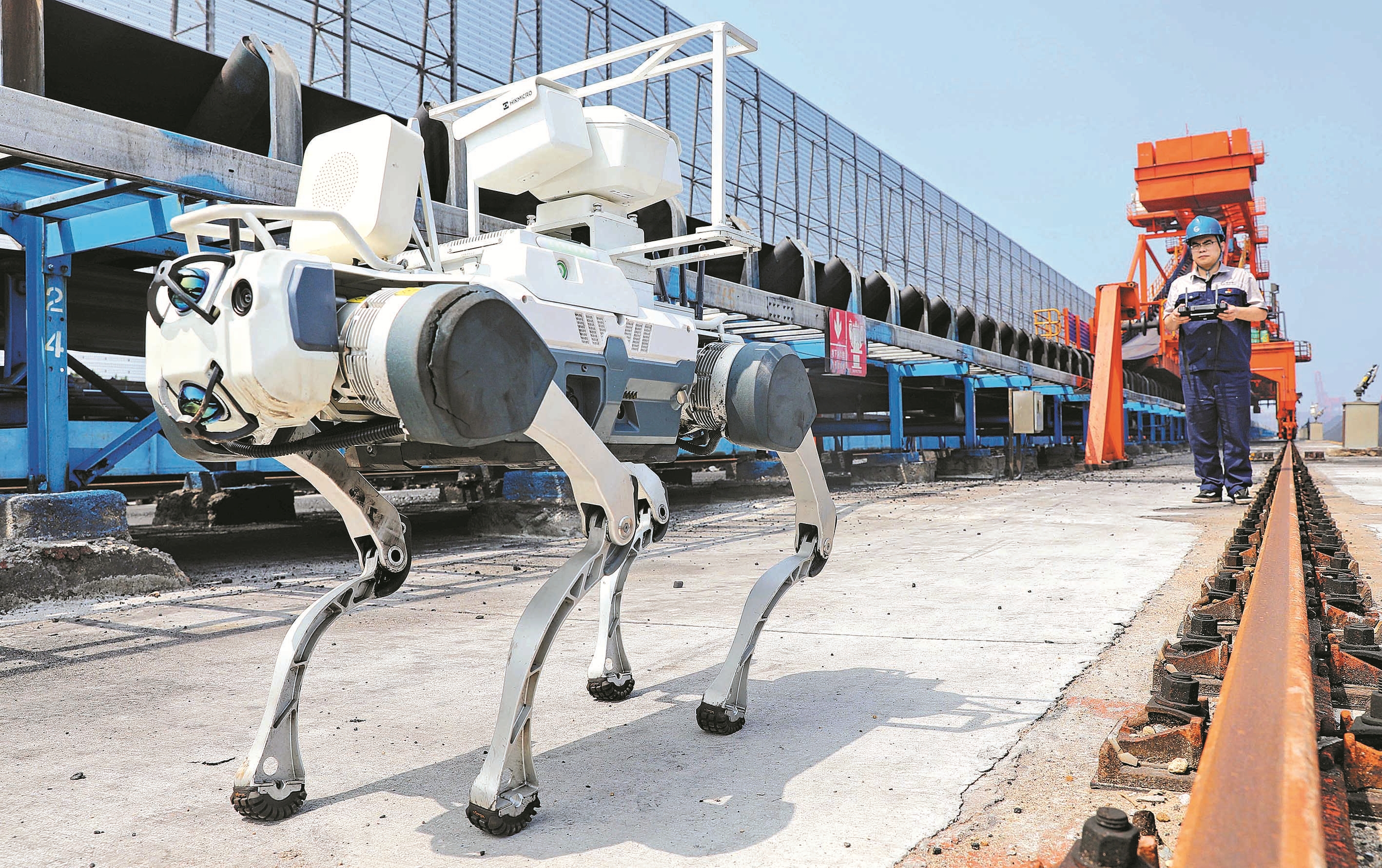 7月23日,在秦港股份九公司貨運(yùn)現(xiàn)場,一只機(jī)器狗正邁著矯健的步伐穿梭在煤炭堆場,進(jìn)行皮帶機(jī)巡檢。