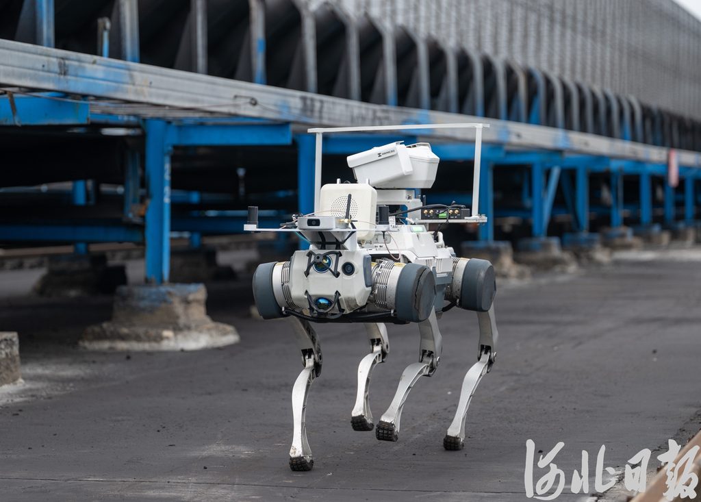 7月30日,河北港口集團秦港股份煤炭堆場,四足仿生機器人正在巡檢。