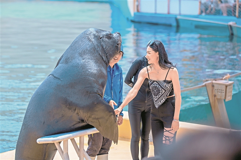 游客與海洋動(dòng)物親密接觸。