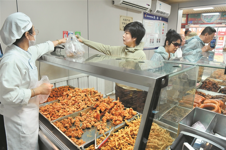 顧客循香而來,選購金黃酥脆的山海關炸肉。