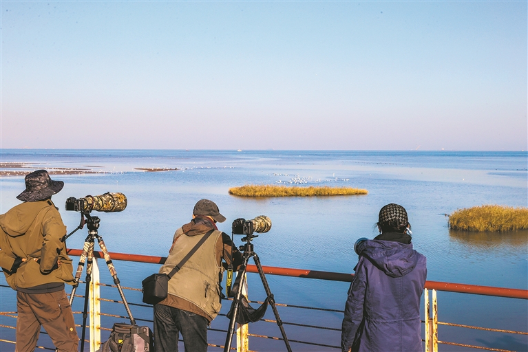 大潮坪木棧道上,觀鳥愛好者正在拍攝海鳥。