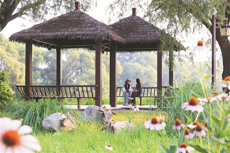 見縫插綠的口袋公園內(nèi),居民坐在亭子中休息。