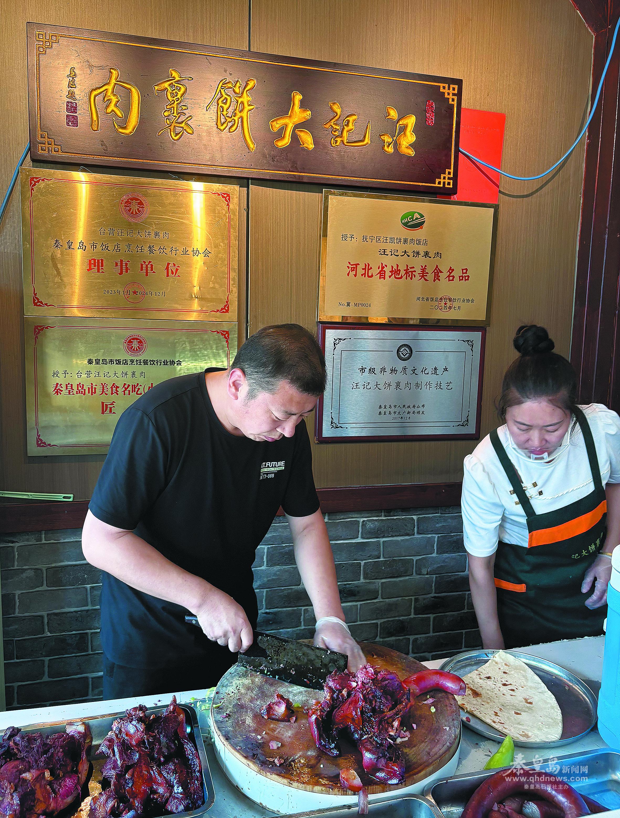 “兩碗羊湯,一盤豬頭肉,好嘞,美女!”快到午時,300平方米的店鋪已經(jīng)坐滿了,大堂里回蕩著杜冬梅赫亮的嗓音。有的客人拎上幾套熱騰騰的大餅裹肉上了車,有的則買了雞蛋湯或是小菜坐下來吃。慕名而來的新客人仔細(xì)觀賞墻上懸掛的自清末、經(jīng)民國、到如今汪記大餅裹肉各個時期經(jīng)營場景的繪畫,或是數(shù)一數(shù)“河北省地標(biāo)美食名品”“秦皇島市美食名吃(小吃)展演大賽匠心獎”等獎牌。
