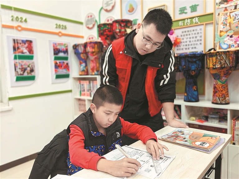在“小候鳥驛站”,志愿者給小學(xué)生輔導(dǎo)功課。通訊員 周磊 攝