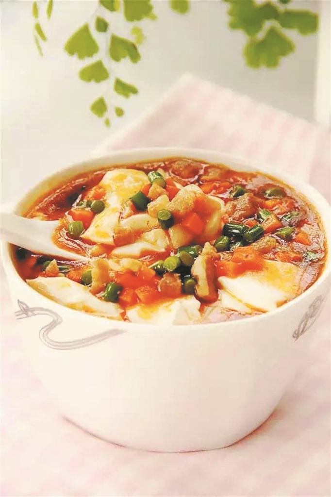 湯鹵佐料與豆腐腦的結(jié)合相映成趣。