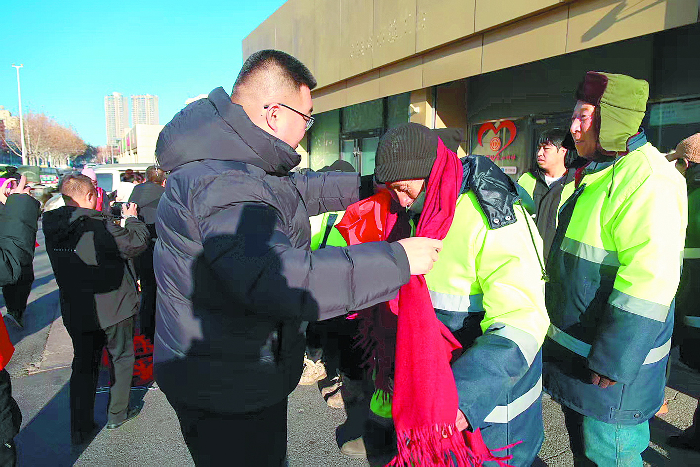 嶄新厚實(shí)的棗紅色圍巾,圍在環(huán)衛(wèi)工人的脖子上,瞬間增添了幾分冬日的暖意。