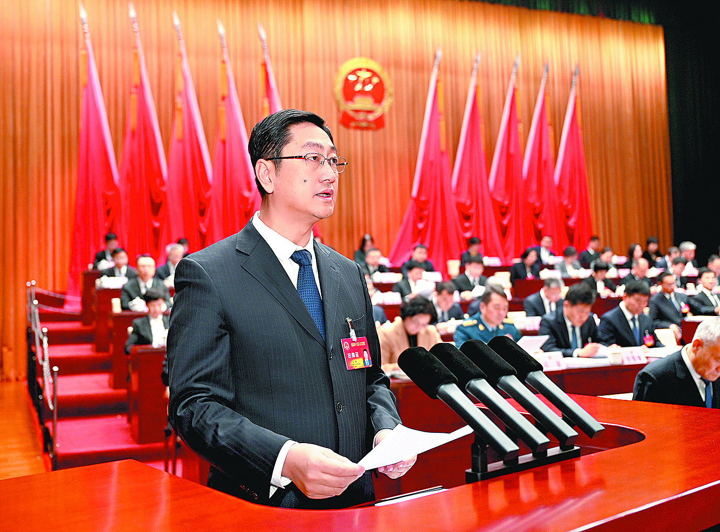 石磊作政府工作報(bào)告。 記者 劉曉 攝