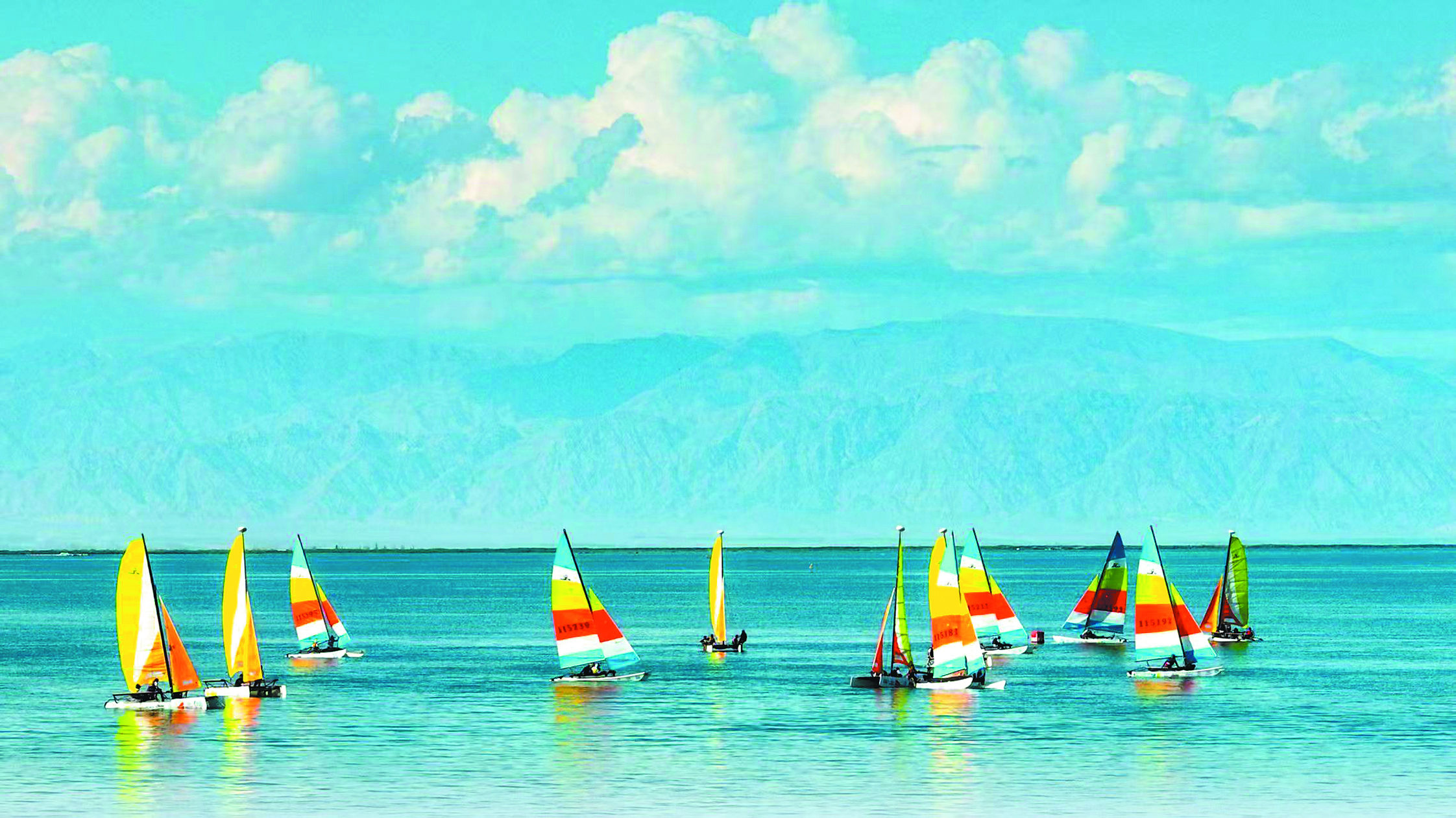 博湖縣首屆水上運動旅游節(jié)暨“西海秦博杯”Hobie帆船公開賽在博斯騰湖大河口景區(qū)揚帆開賽。(圖片由秦皇島市援疆工作前方指揮部提供)