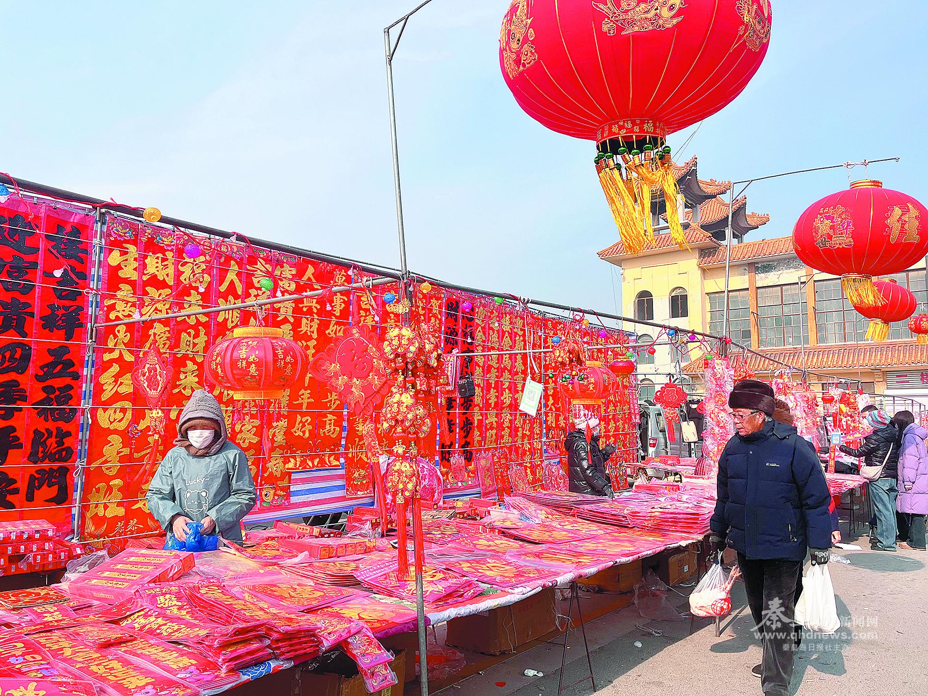 記者踏入大集,眼前是一片紅彤彤的景象——春聯(lián)攤位上,燙金的春聯(lián)、福字在晨光中熠熠生輝,各式燈籠隨風(fēng)搖曳,將整個集市裝點得喜氣洋洋。