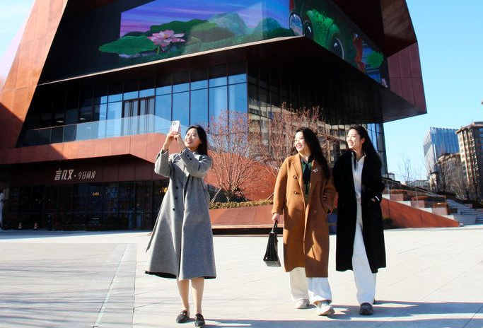 近日,三名來自不同城市的年輕教師在雄安新區(qū)容東片區(qū)街頭賞景看春(圖片來源:河北日報)