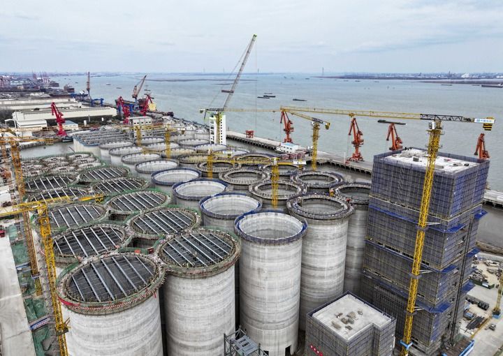 在江蘇省靖江市拍攝的中糧靖江碼頭倉儲物流項目建設現(xiàn)場(2025年2月20日攝,無人機照片)。新華社發(fā)(顧繼紅 攝)