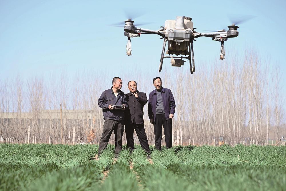 在小麥田間,遷西縣農(nóng)技專家現(xiàn)場(chǎng)指導(dǎo)農(nóng)戶操作植保無(wú)人機(jī),開(kāi)展春季麥田病蟲(chóng)害統(tǒng)防統(tǒng)治作業(yè)。