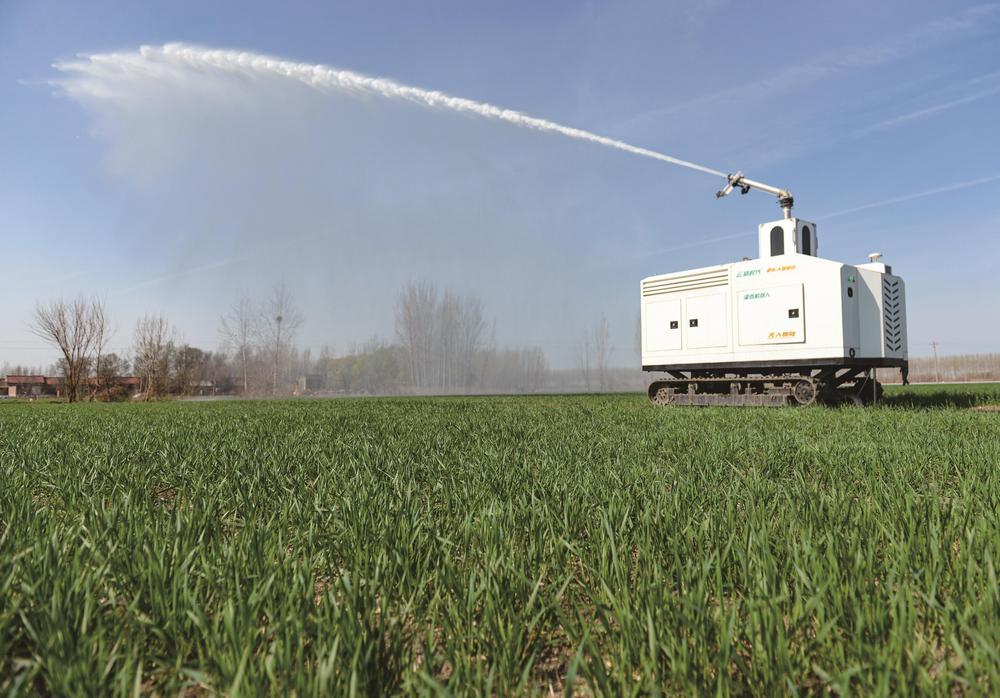 玉田縣會(huì)軍農(nóng)機(jī)農(nóng)民專業(yè)合作社麥田里自走式噴灌機(jī)正在噴灌作業(yè)。