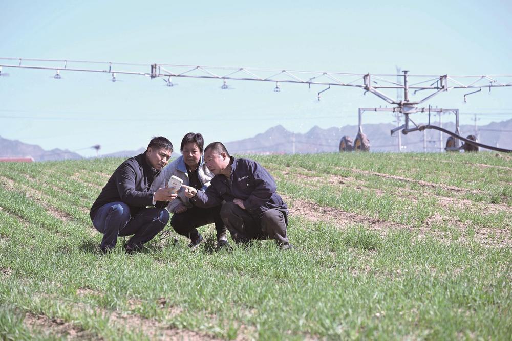 遷西縣羅家屯鎮(zhèn)綠源家庭農(nóng)場(chǎng),農(nóng)業(yè)技術(shù)推廣人員使用智能監(jiān)測(cè)設(shè)備,精準(zhǔn)掌握麥田墑情,科學(xué)開(kāi)展灌溉管理。