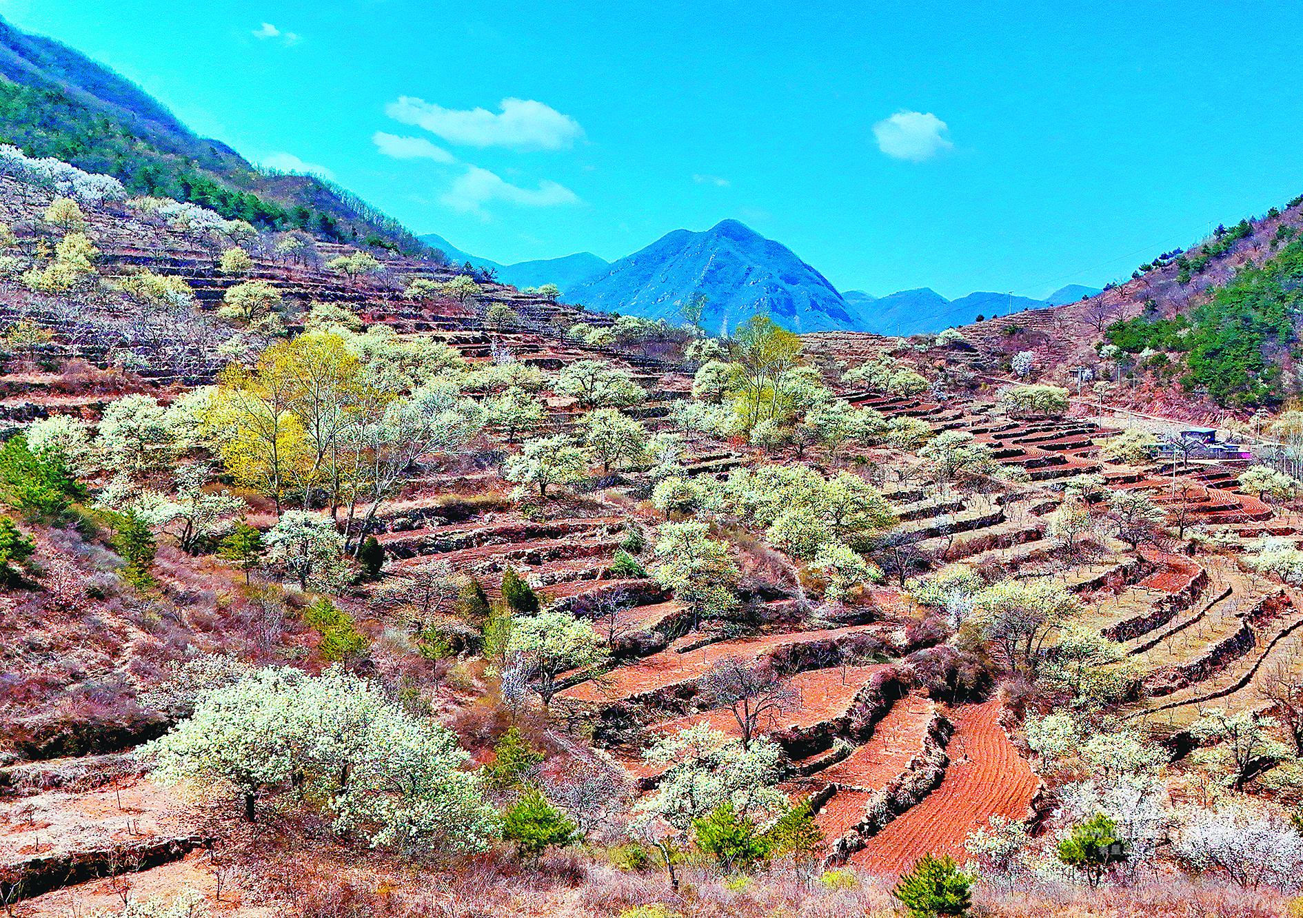 梯田上盛開的梨花,與蜿蜒的明長城遺址交相輝映,吸引眾多游客前來踏春賞花、打卡游玩,共赴這場浪漫的春日之約。記者 李鐸 見習記者 陳立桐 攝