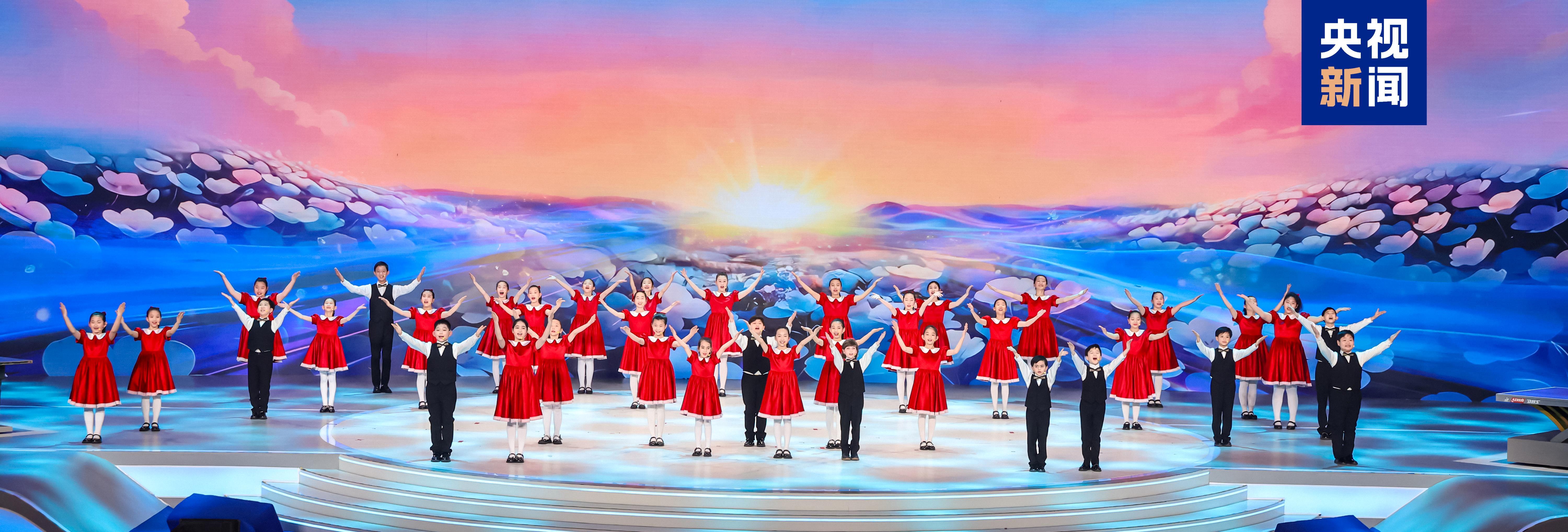 △中美“乒乓外交”55周年紀(jì)念大會(huì)上,中美青少年合唱歌曲《銀球飛舞花盛開》。