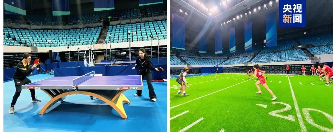 △中美“乒乓外交”55周年紀(jì)念大會(huì)現(xiàn)場(chǎng),中美乒乓球與橄欖球跨項(xiàng)目互動(dòng)體驗(yàn)。